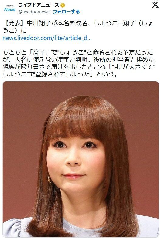 @livedoornews【発表】中川翔子が本名を改名、しようこ→翔子(しょうこ)に news.livedoor.com/lite/article_d… もともと「薔子」で"しょうこ"と命名される予定だったが、人名に使えない漢字と判明。役所の担当者と揉めた親族が殴り書きで届けを出したところ「"よ"が大きくて"しようこ"で登録されてしまった」という。 pic.twitter.com/qaI78wphQg